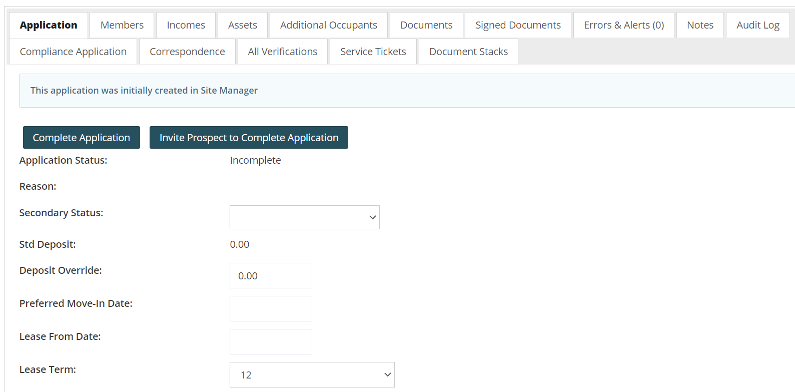 When using the Create Application function, if an applicant starts an application and then requires assistance, it is possible for a site manager to complete the existing application on their behalf without having to create a brand-new application.