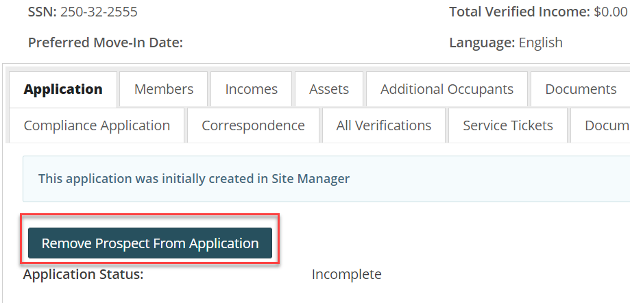 The permission Compliance - Remove Prospect From Application controls a user's ability to use this feature. Remove Prospect from Application will only be available if the site manager has the permission set, the application is a site manager created application, a prospect has been linked to the application and the application has not already been submitted.