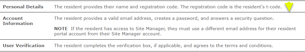 Before a resident can register for Resident Portal, you must send the resident their registration code. A registration code is the resident’s t-code. You can find the t-code on the resident record in Voyager or on the User Management dashboard in Site Manager.