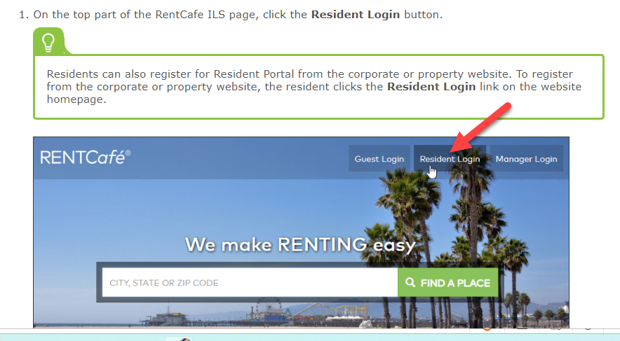 When prospects apply through online leasing, they are automatically registered for a Resident Portal account. Residents who are currently living at your property but are not registered for resident services can still register for Resident Portal from the property website, the corporate website, or the RentCafe ILS (RENTCafe.com). Residents must verify their email addresses when they register.