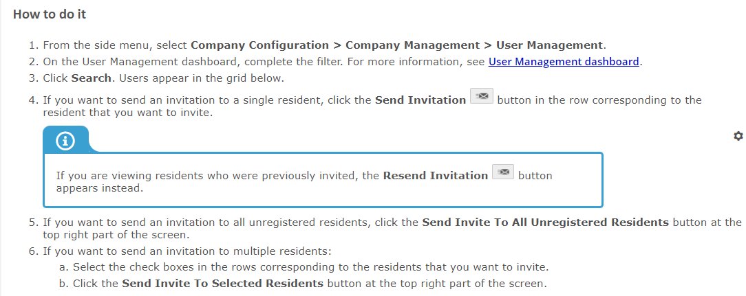 If a resident already has a record in Voyager with a valid email address, you can invite them to log in to Resident Portal. You can invite a single resident, multiple residents, or all unregistered residents at once from the User Management dashboard in Site Manager.